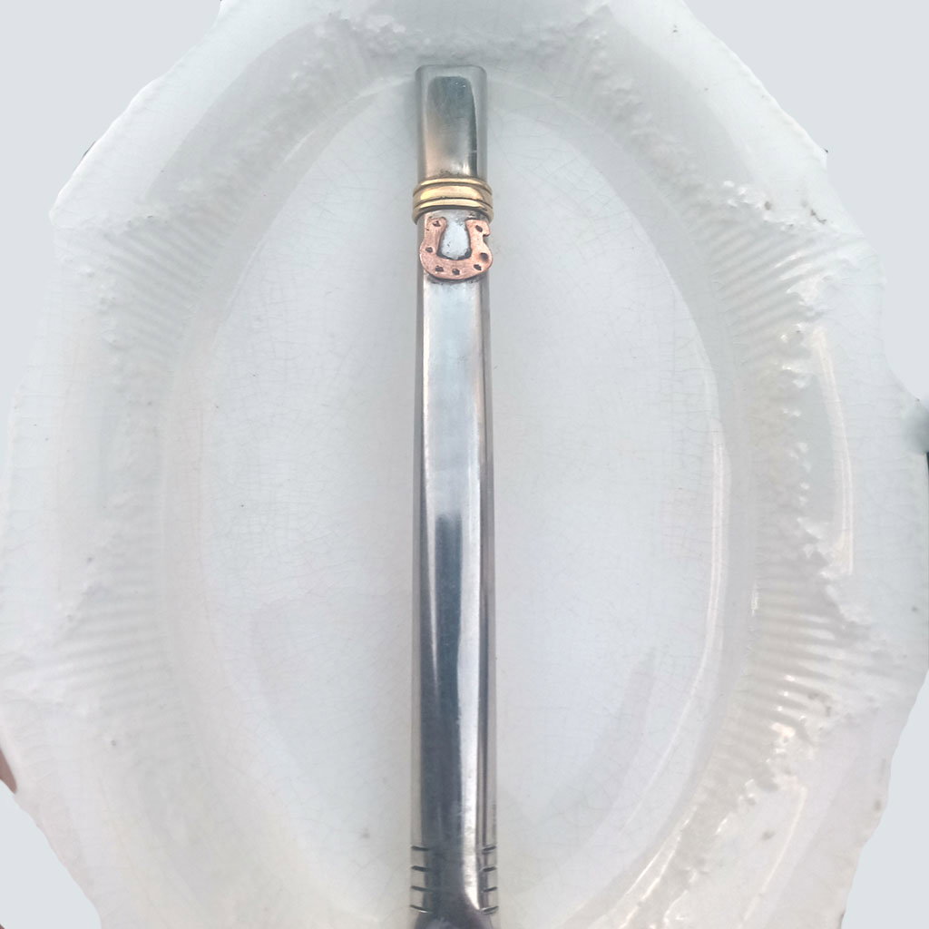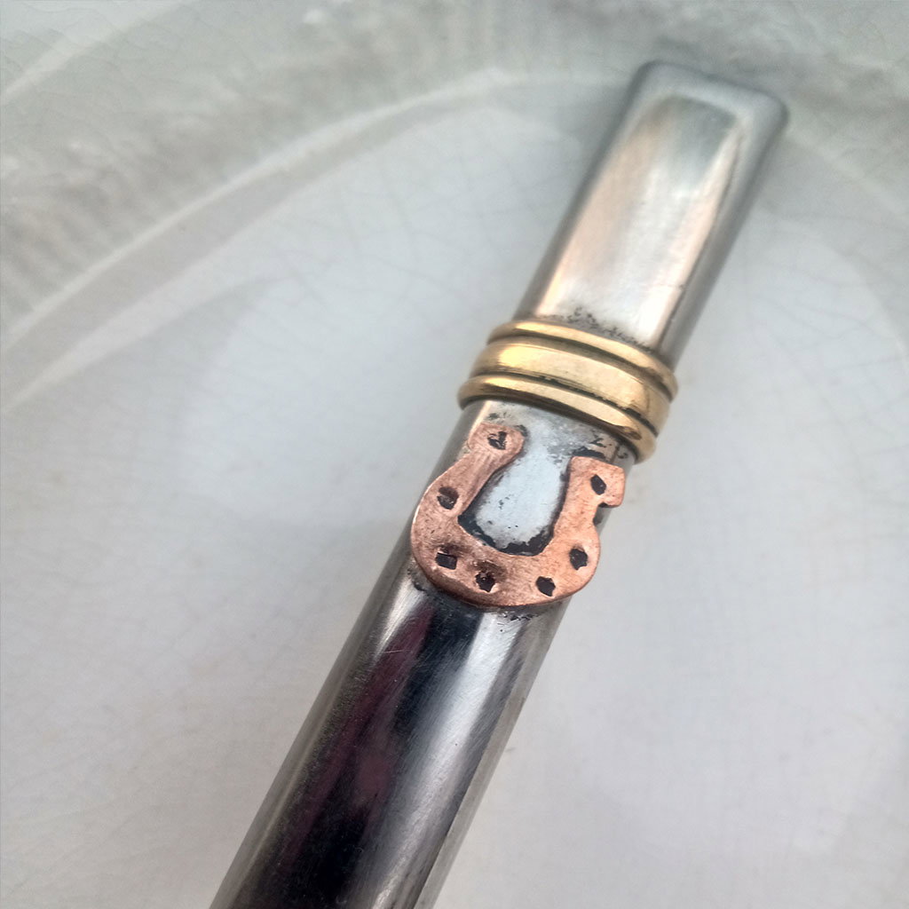 Bombilla con virola de bronce y aplica de herradura en cobre con siete puntos. Según las creencias, la herradura debe llevar siete clavos que es un número con significado propio en neurología. El número siete significa buen augurio. Es por eso que esta bombilla te durara suerte siempre que la lleves contigo