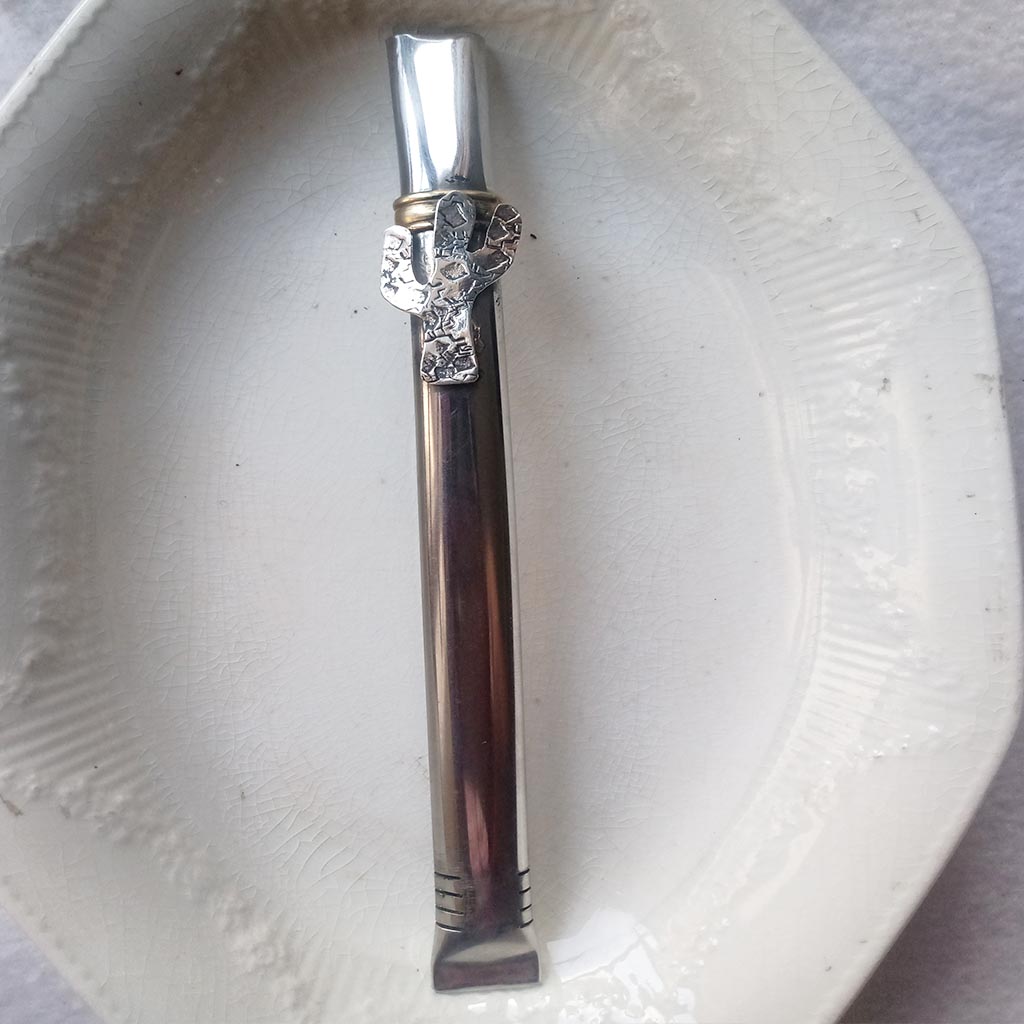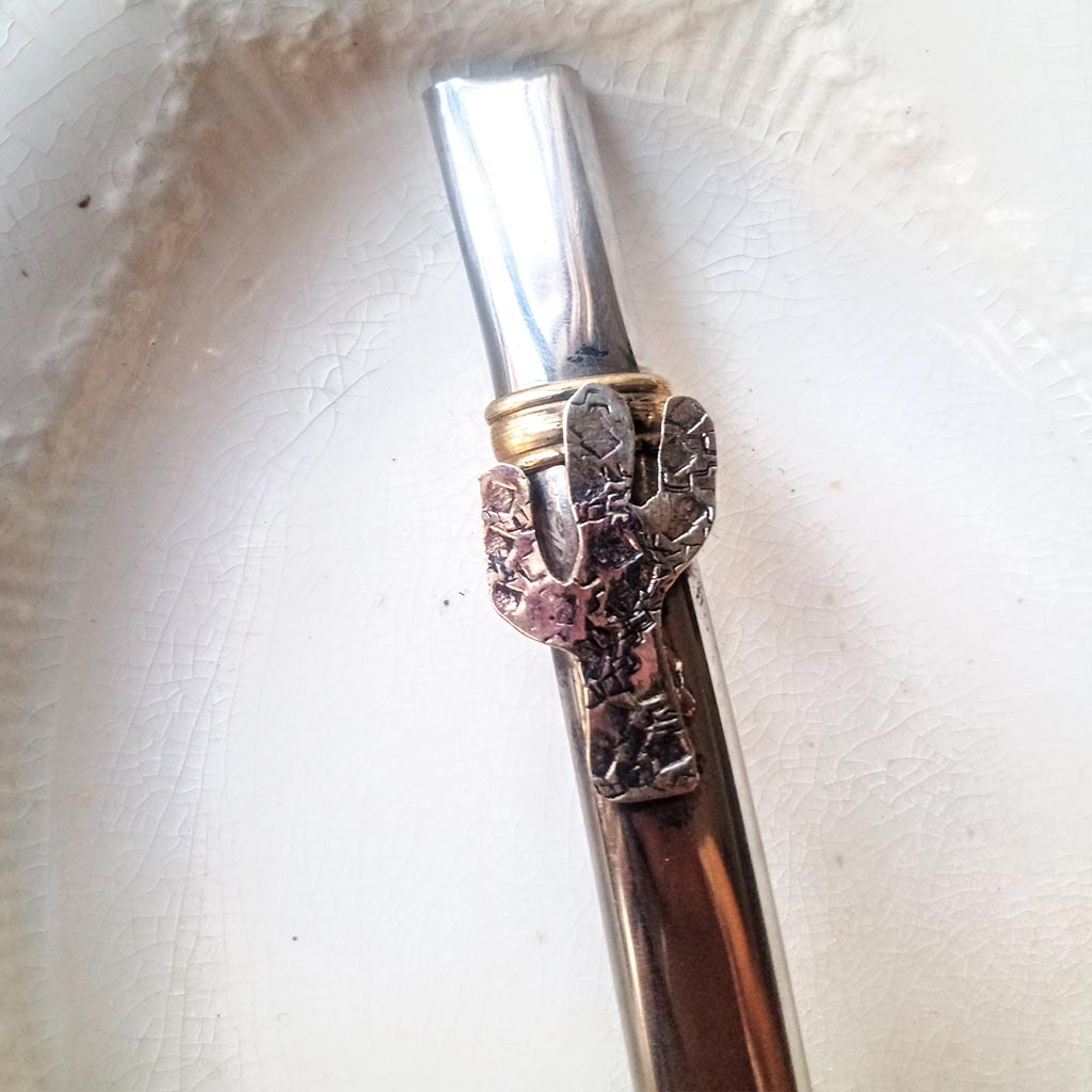 Bombilla con aplique de cactus de alpaca y cincelado. Virola de bronce. No se tapa, ni se oxida.