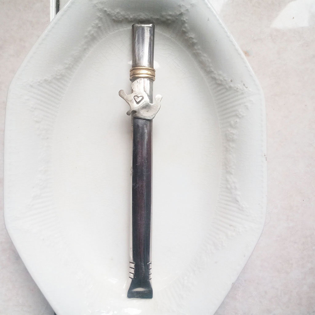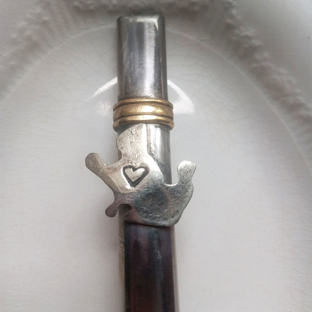 Bombilla con aplique de gato de alpaca. Virola de bronce. No se tapa, ni se oxida. ideal para los fans de los gatos