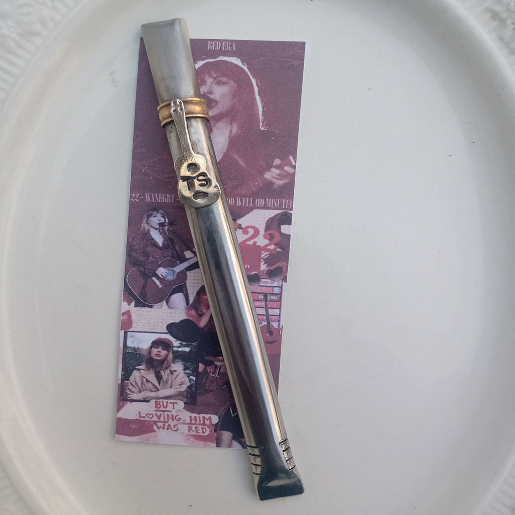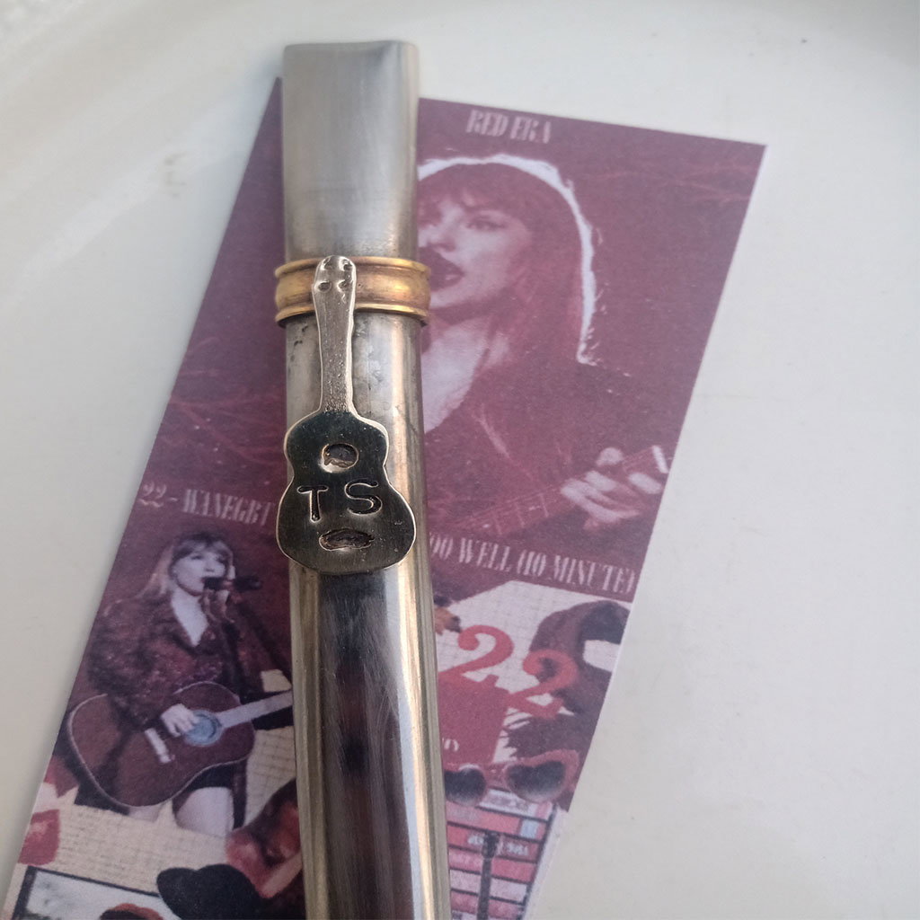 Bombilla con aplique de guitarra e iniciales << T.S>> Virola de bronce. No se tapa, ni se oxida. ideal para fans.