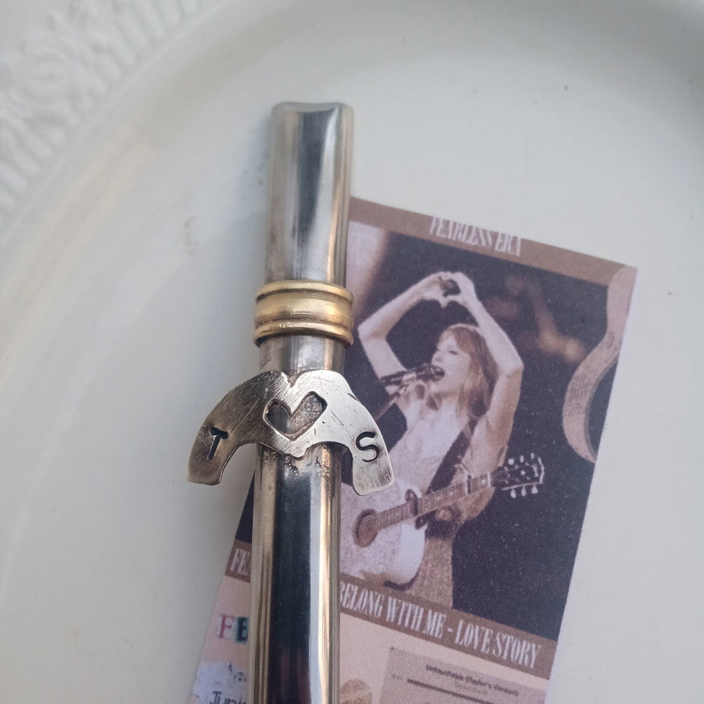 Bombilla con aplique de corazón de mano e iniciales << T.S>> Virola de bronce. No se tapa, ni se oxida. ideal para fans.