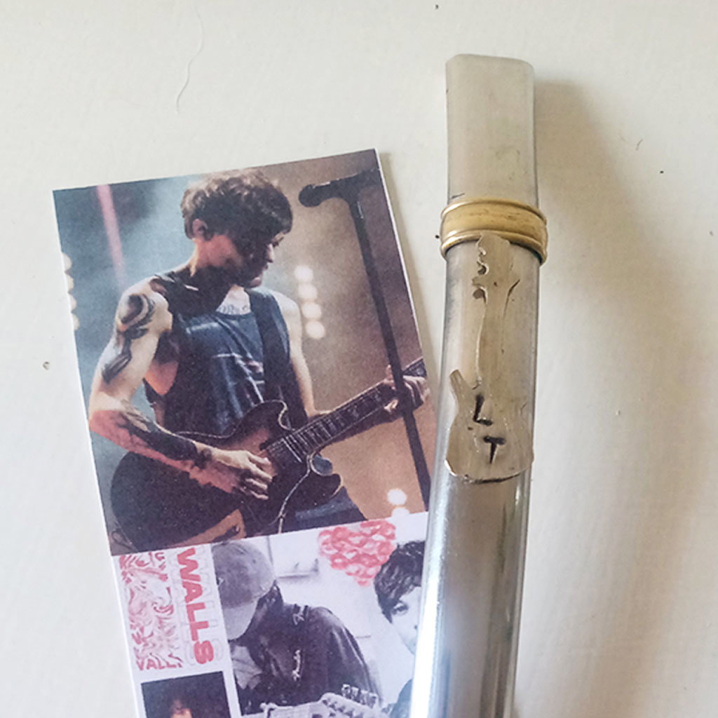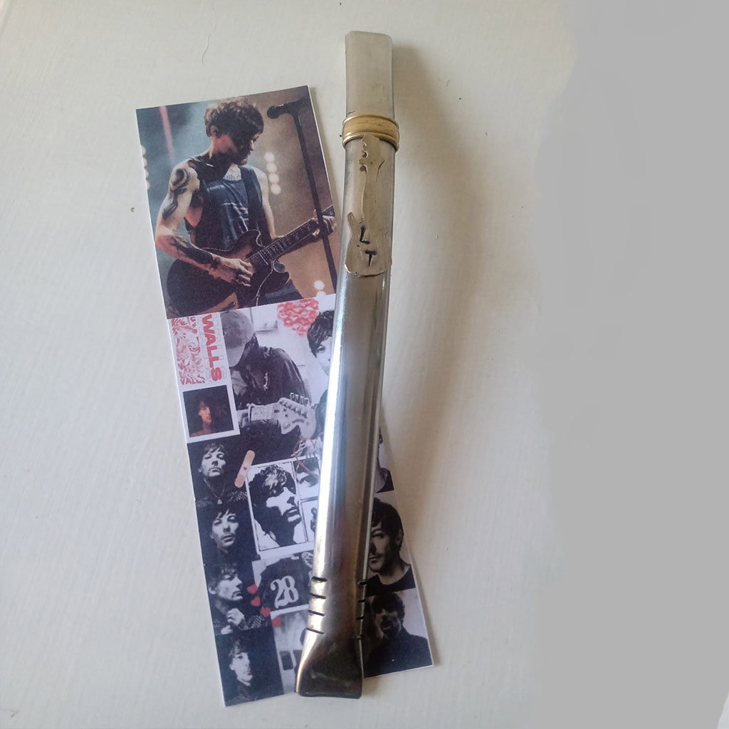 Bombilla con aplique de guitarra eléctrica con iniciales << L. T >> de alpaca Virola de bronce. No se tapa, ni se oxida. ideal para fans.