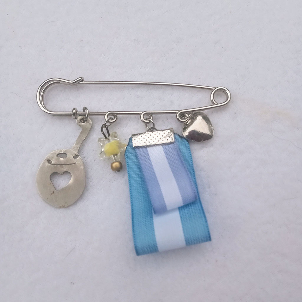 Dijes de mate, estrella tipo acrílica y dije corazón de fundición de níquel con cintas Argentina. Gancho alfiler fundición niquel de 8cm en plateado.