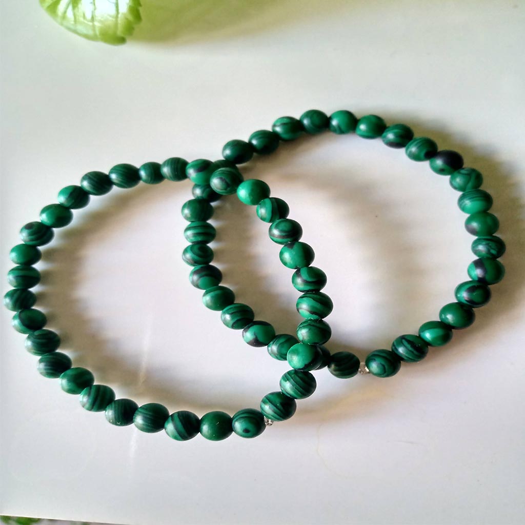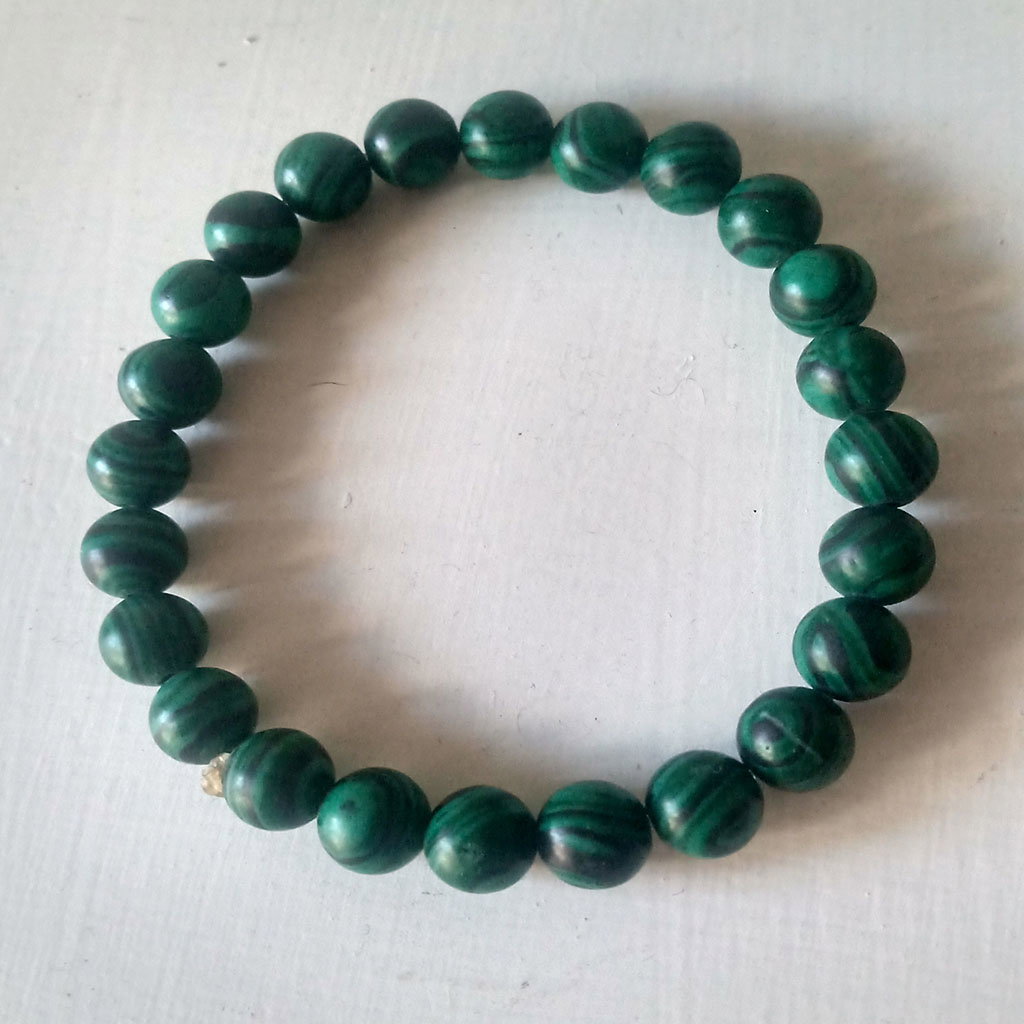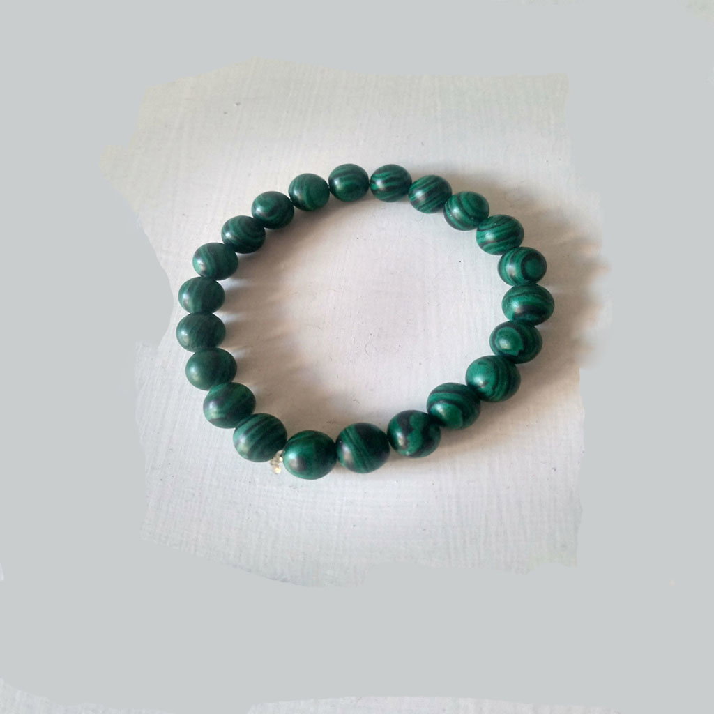Pulsera de piedra natural malaquita enhebrada en tanza elástica.