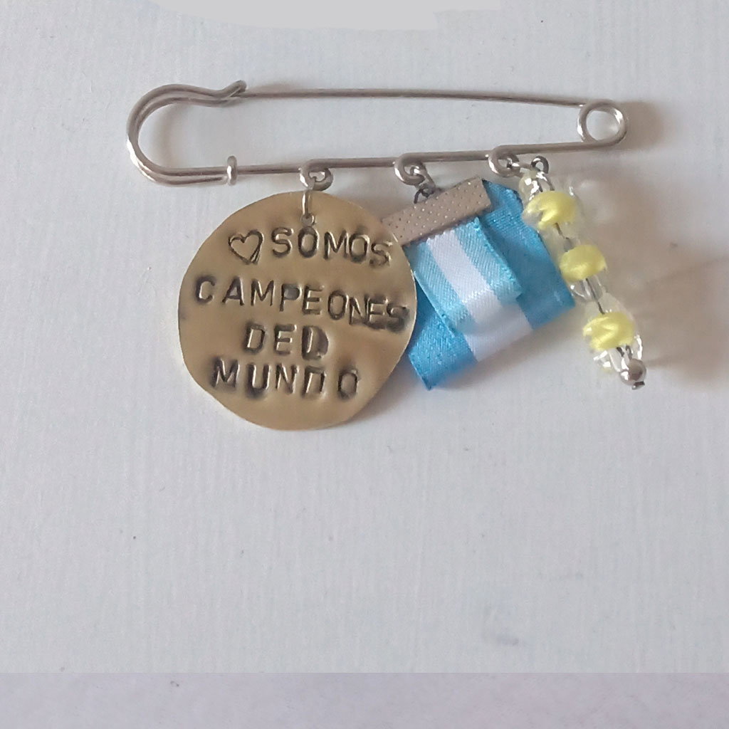 Dijes de circular de bronce con frase “somos campeones del mundo “y tres estrellas de tipo acrílicas. cintas Argentina y una pequeña flor de tela color azul. Gancho alfiler de 8cm en plateado.