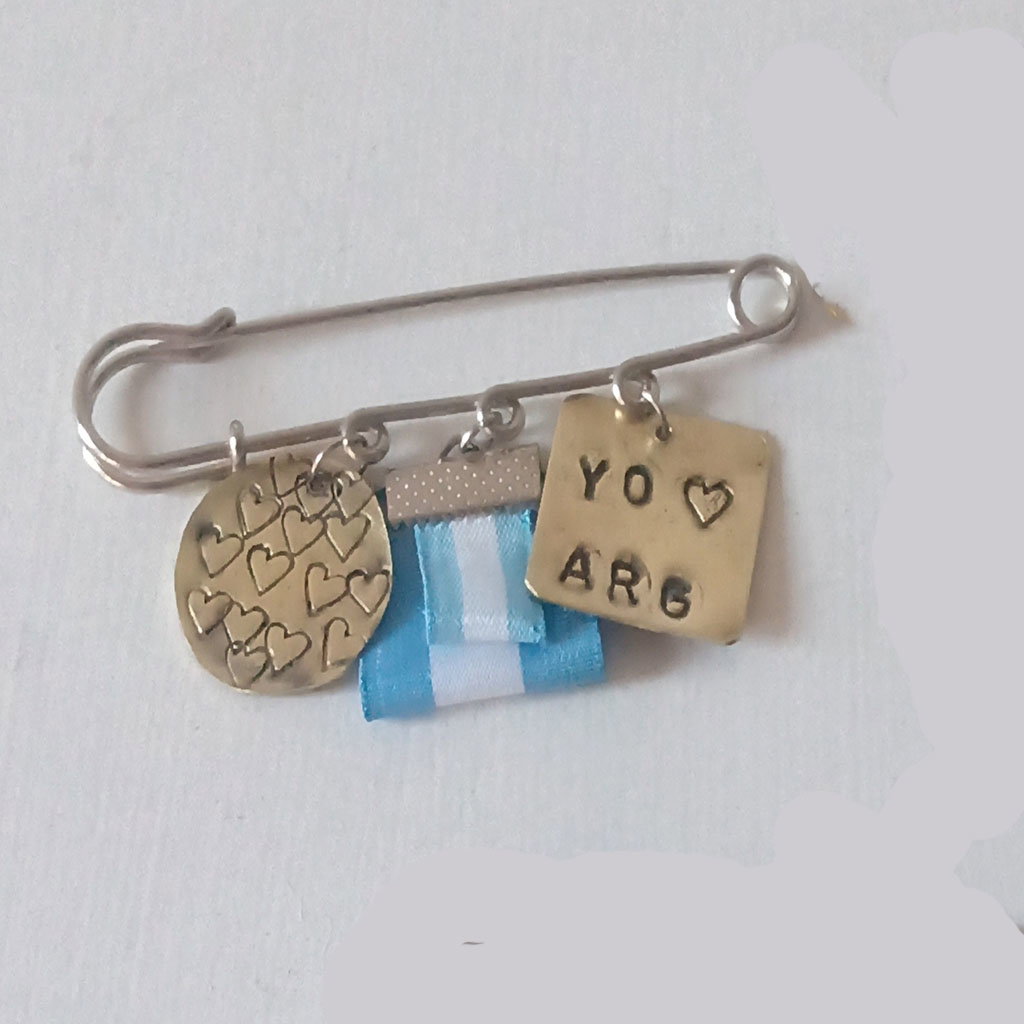 Dijes de circular de bronce cincelados con corazones y cuadrado con frase “yo corazón argentina“. Cintas Argentina. Gancho alfiler fundición níquel de 8cm en plateado.