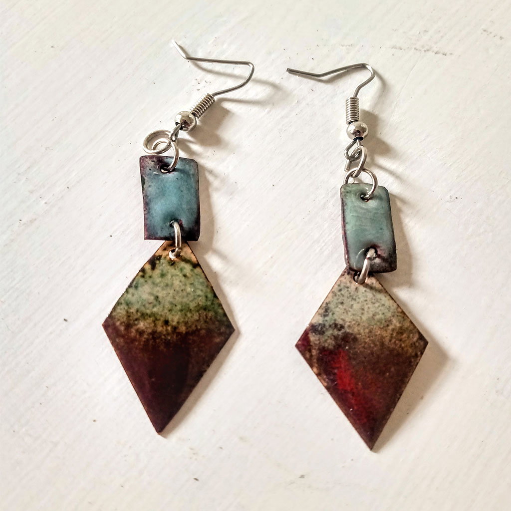 Aros con rectángulos y rombos en tonalidades verde claro, rojo y celeste. hecho en cobre esmaltados a fuego . pasantes de acero quirúrgico