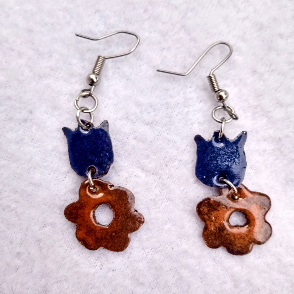 Aros con flores en tonalidades azul y naranja hecho en cobre esmaltados a fuego . pasantes de acero quirúrgico