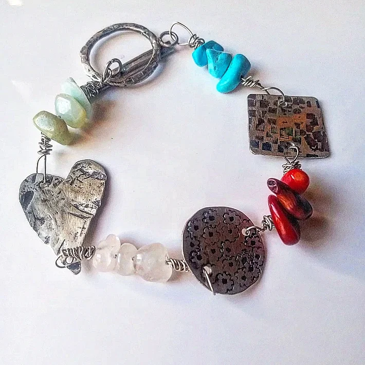Pulsera de alpaca de dijes corazón, cuadrado y circulo cincelados con con piedras naturales de escallas de coral , turquesa ,cuarzo rosa, amazonita-