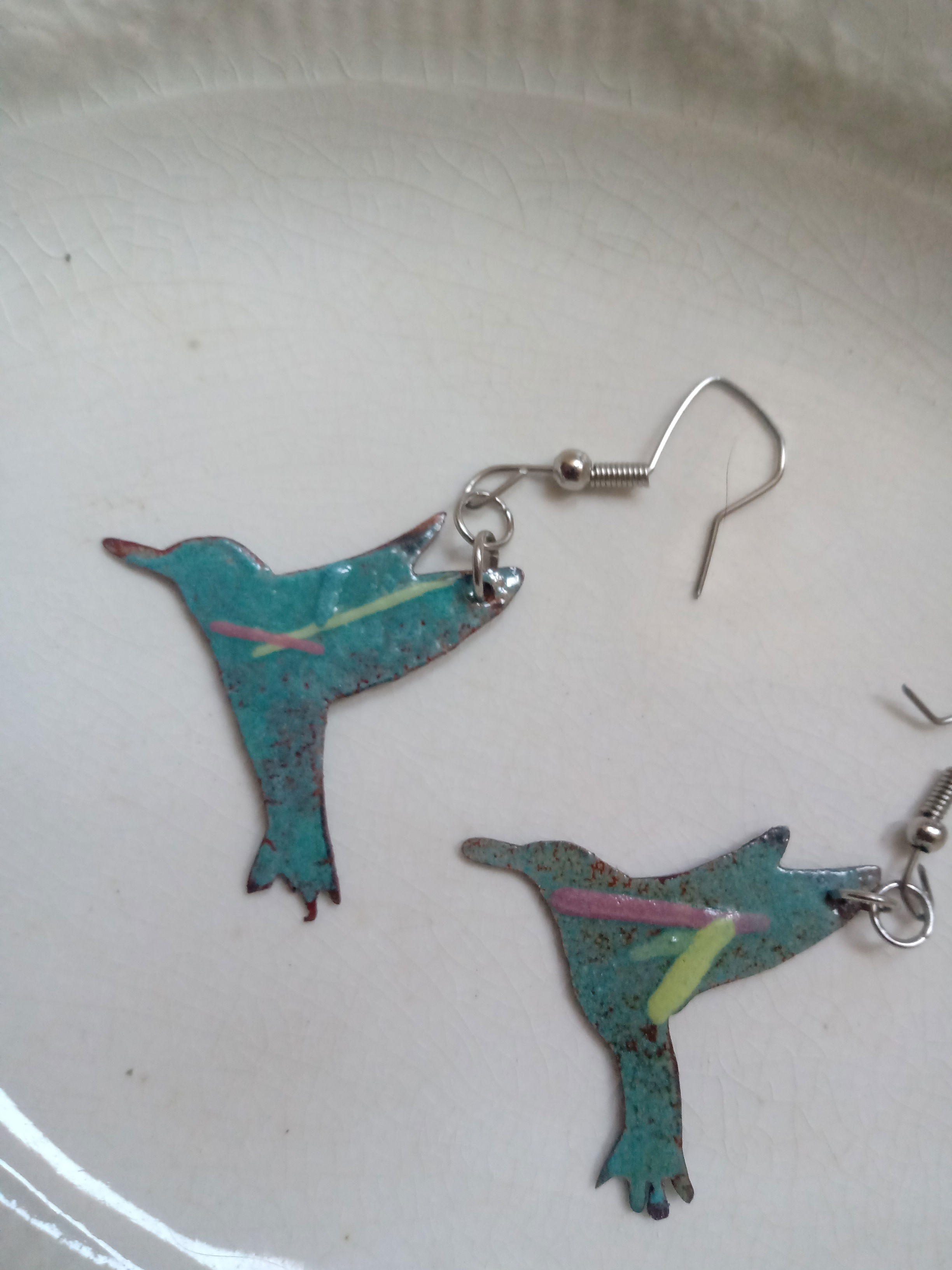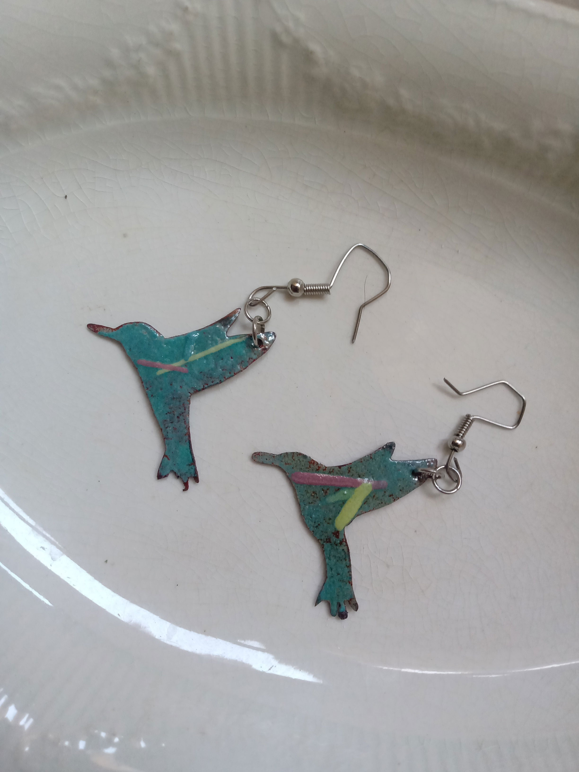 Aros con colibrí hecho en cobre esmaltados a fuego . pasantes de acero quirúrgico