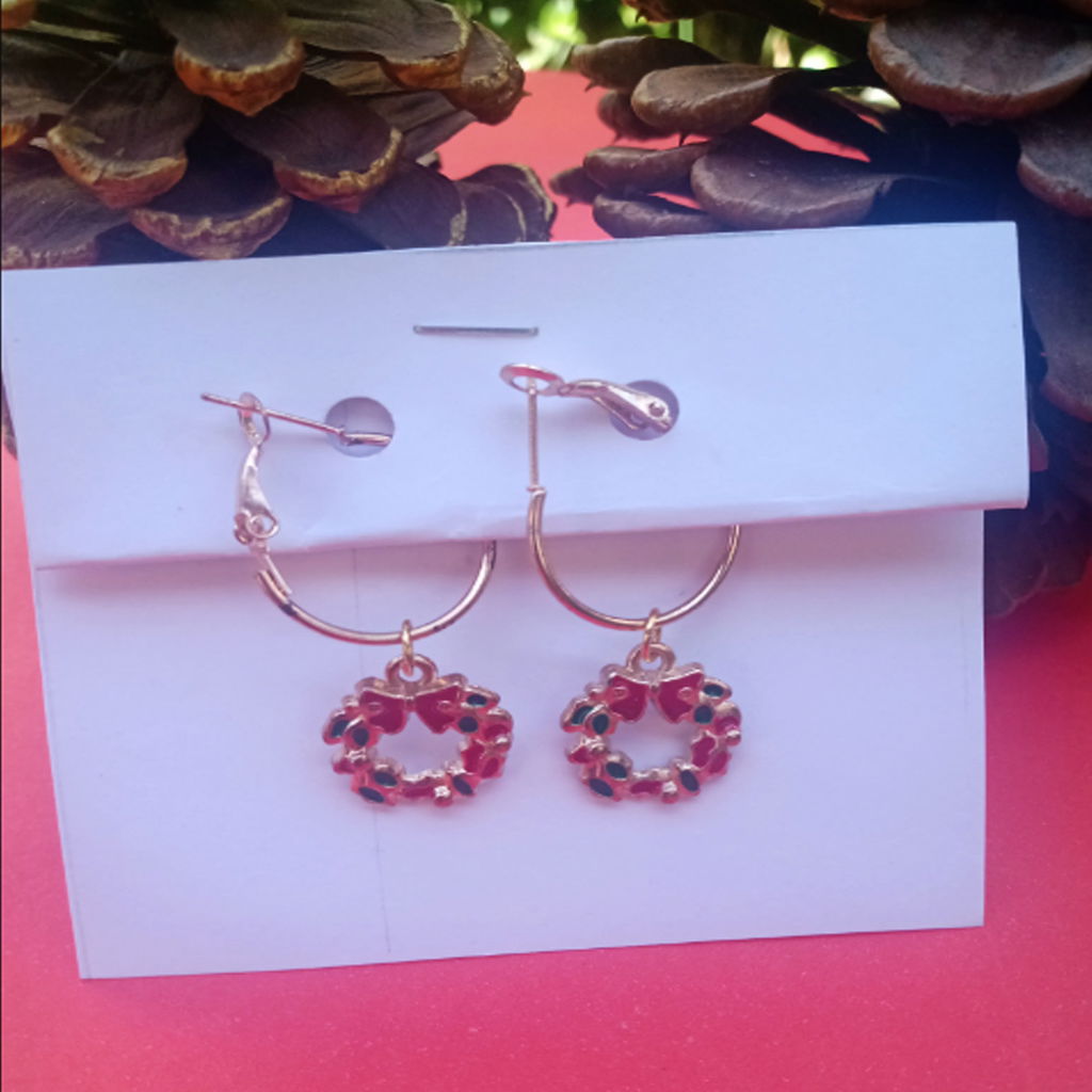 Aros doradas de níquel con dije esmaltados de corona navideña.