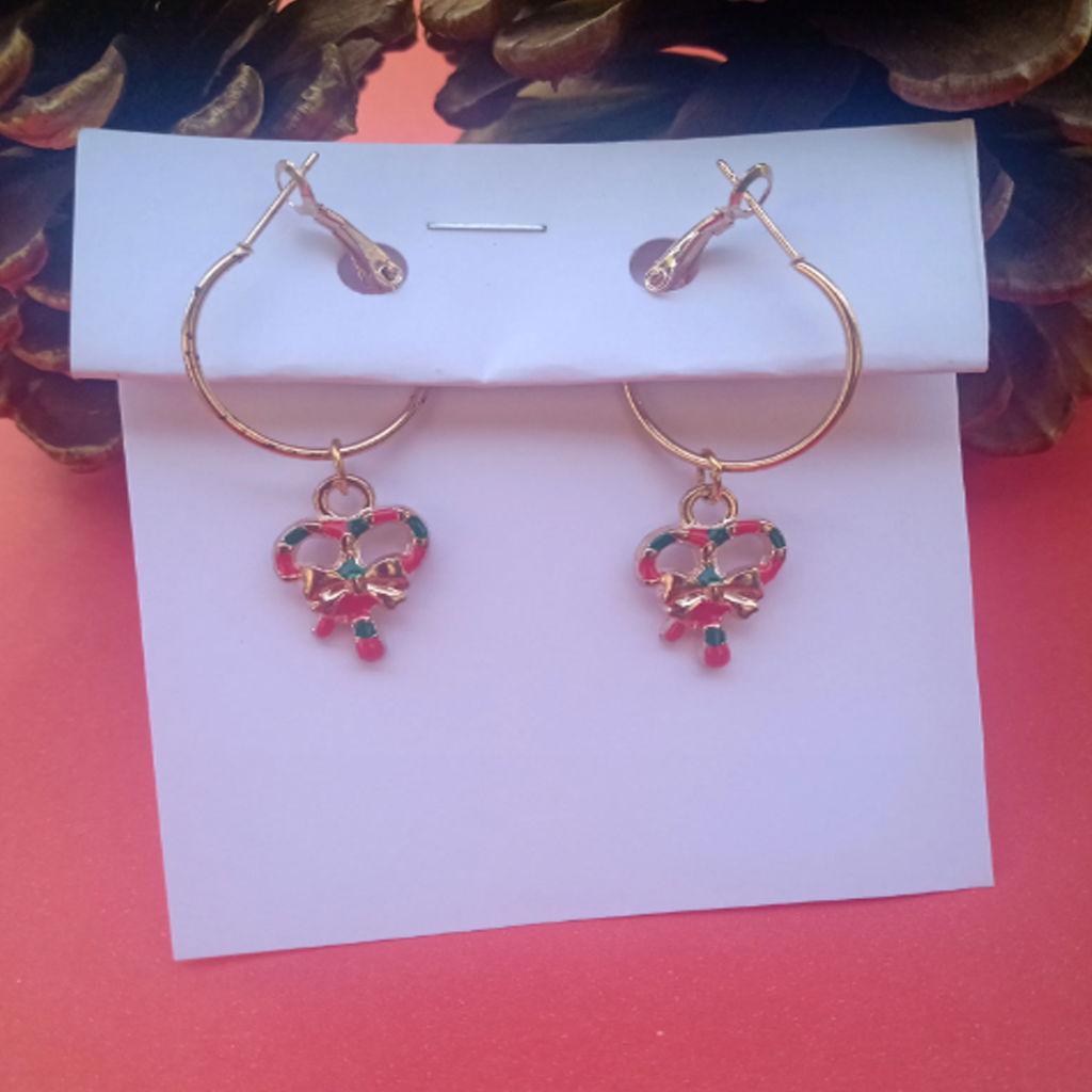 Aros Argollas doradas de níquel con dije esmaltados con moño navideño.