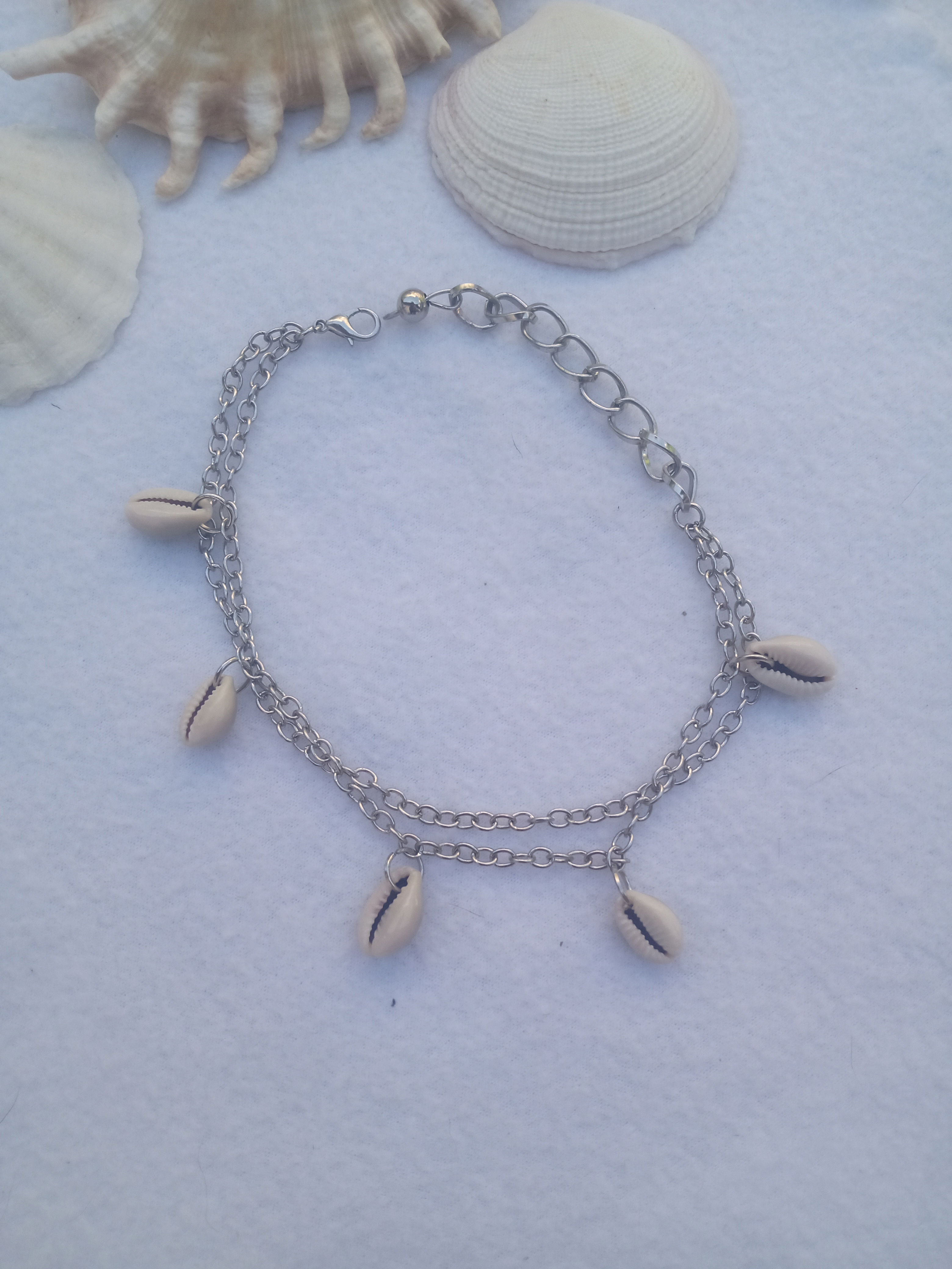 Tobilleras de dijes de caracoles naturales y cadena de n铆quel.