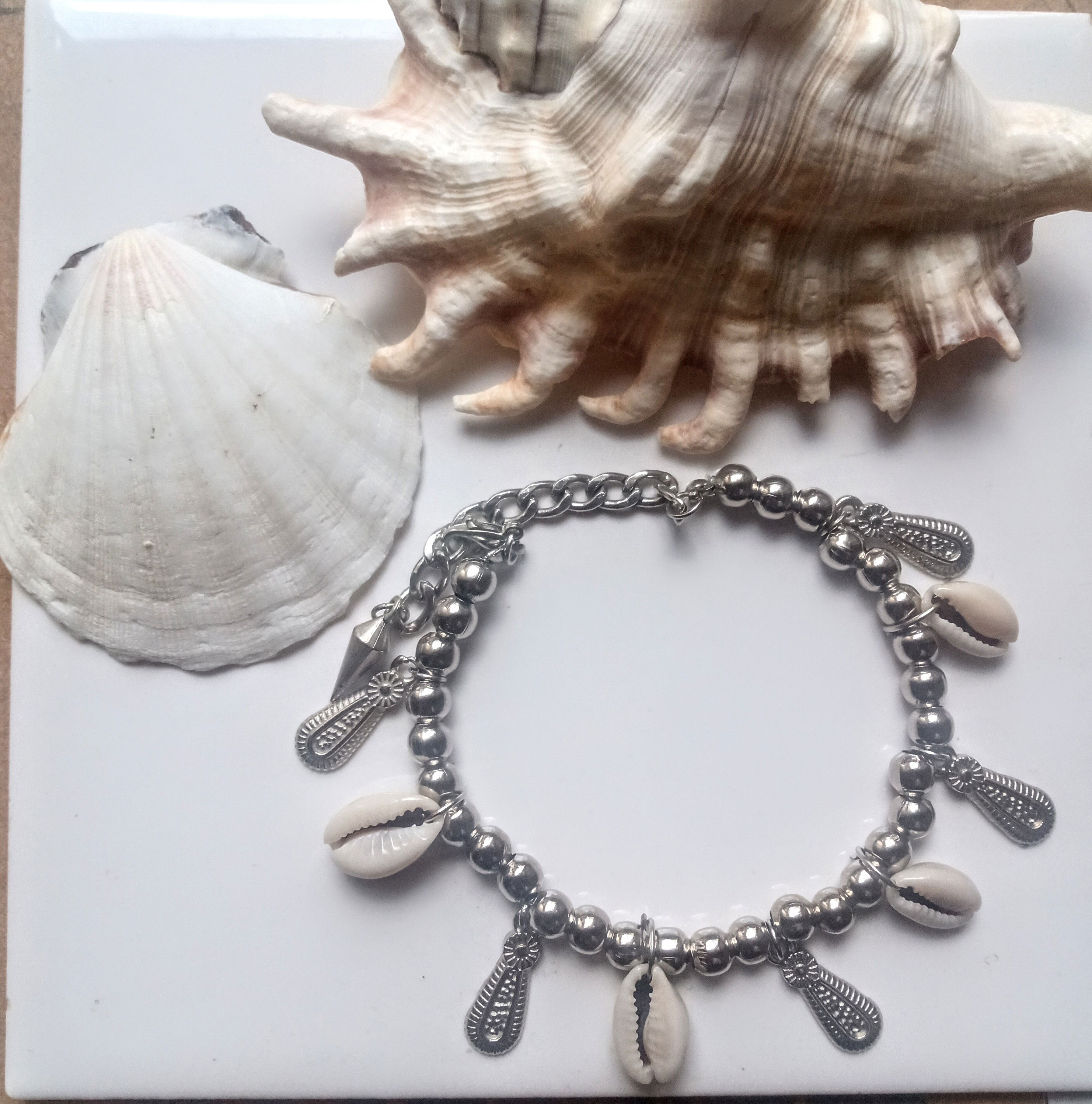 Tobilleras de dijes de caracoles naturales y dijes de níquel. Con mostacillas plateadas.