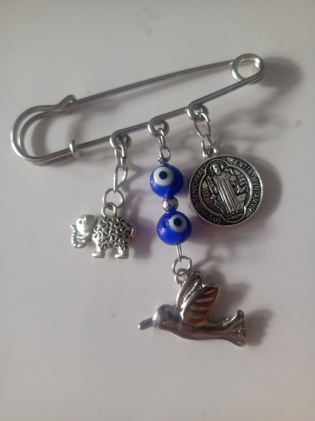 Prendedor con dijes de san Benito, colibrí y elefante. On ojo turco azul Gancho alfiler fundición níquel 6 cm aprox.