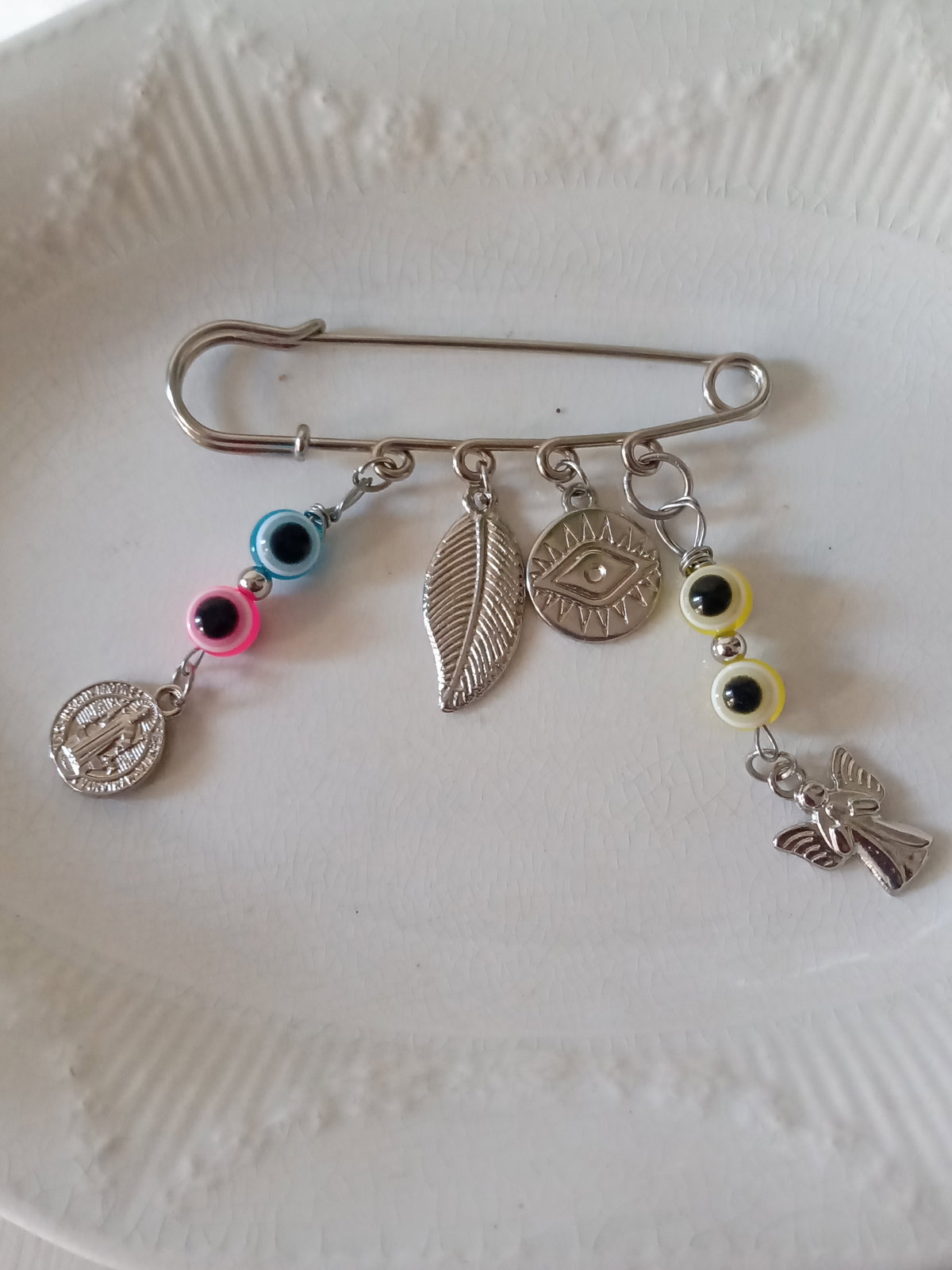 Prendedor con dijes san Benito , ojo turco , pluma y ángel , ojos turco celeste, rosa, y amarillo . Gancho alfiler fundición níquel 6 cm aprox.