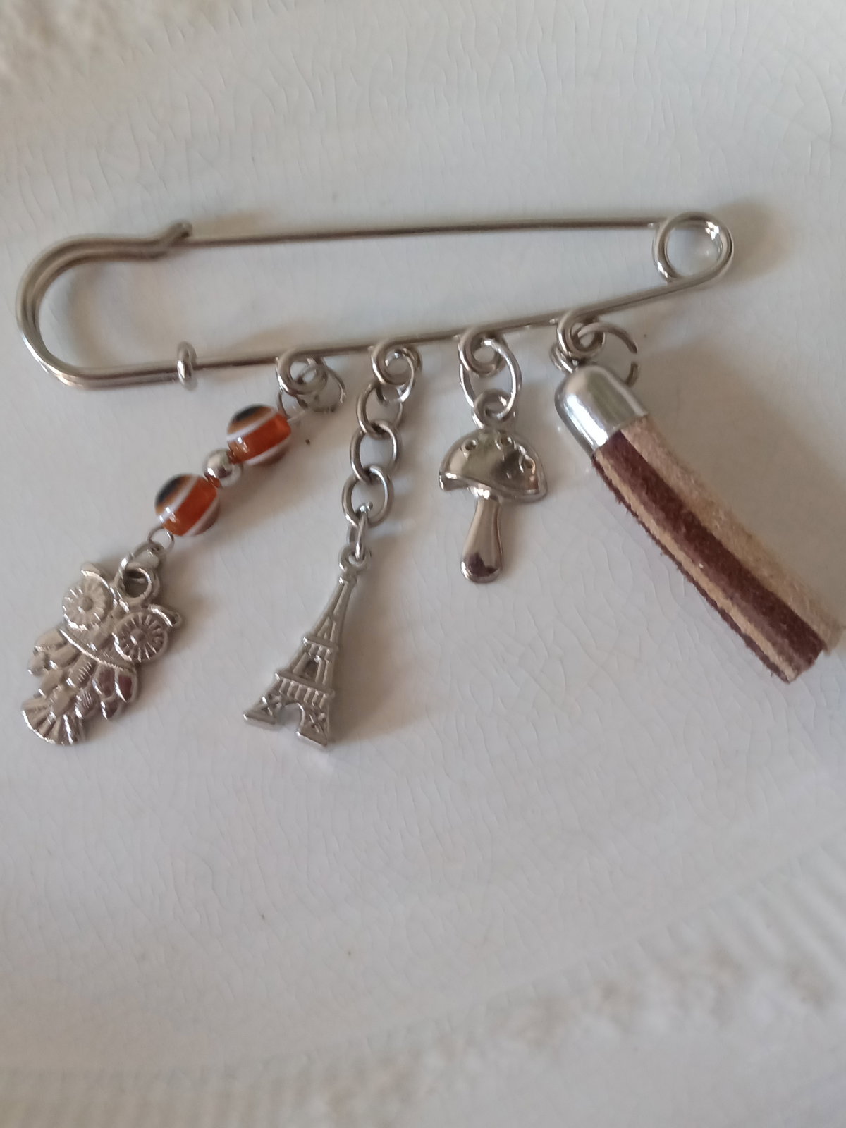 Prendedor con dijes lechuza, hongo , torre Eiffel, y penacho marrón con ojos turco marrón. Gancho alfiler fundición níquel 6 cm aprox.