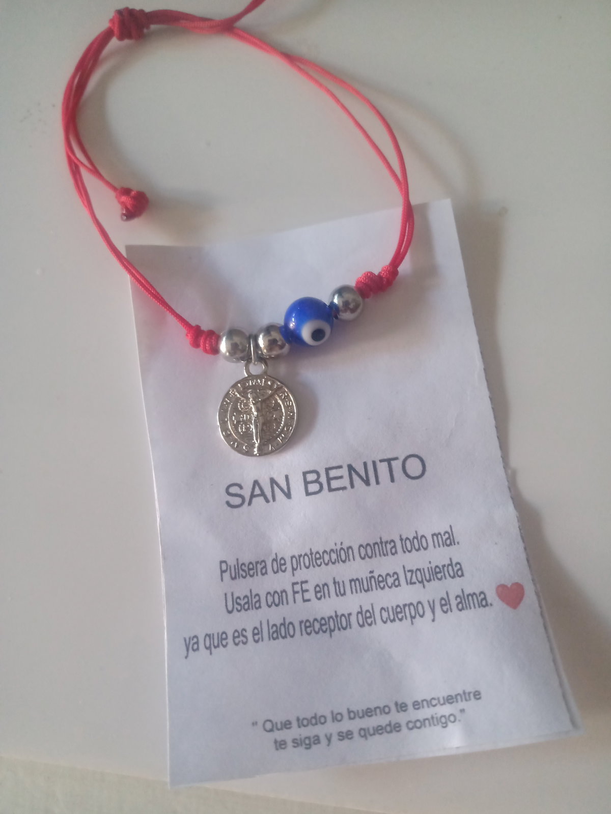 La pulsera de San Benito es un amuleto de protección que combina la fe religiosa de la medalla de San Benito con un símbolo de buena suerte, especialmente en el color rojo. La medalla tiene su origen en la historia del monje San Benito Abad, fundador del monaquismo occidental.