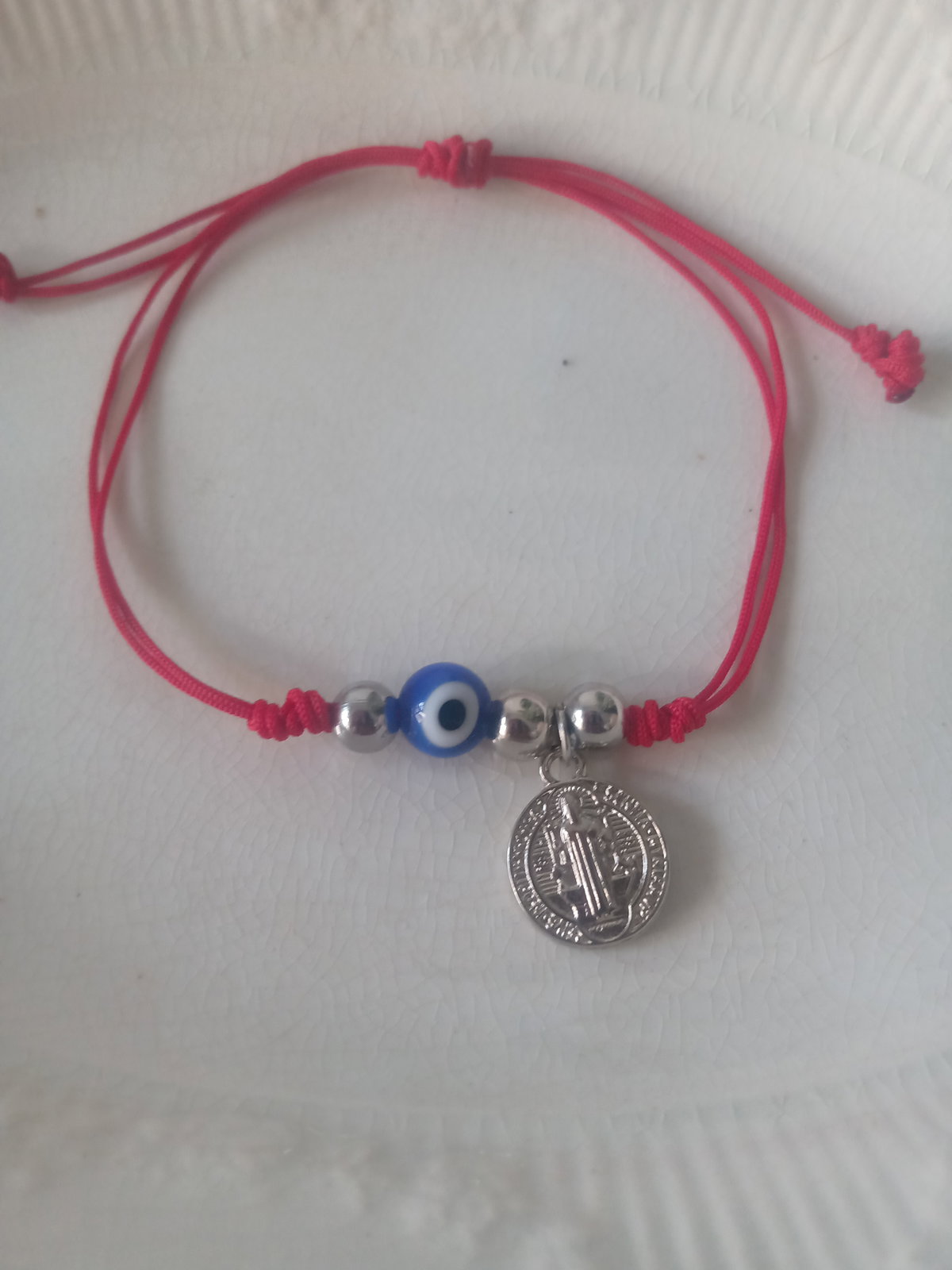Pulsera de hilo chino rojo con Medallita san Benito. Y ojo turco Azul